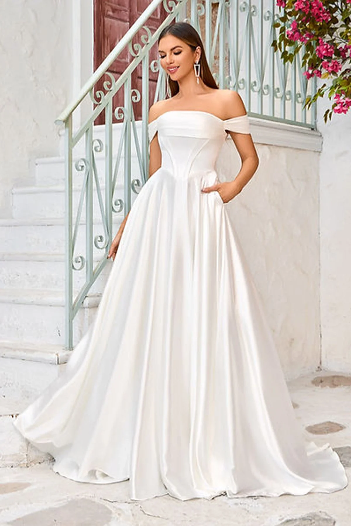 Simply beautiful ivory silk satin A-Line ivory gown with off shoulder sleeves, basque waist, and pockets. Style JA7002 By Jess Adore, sample size 10 but can be ordered in sizes 2-26