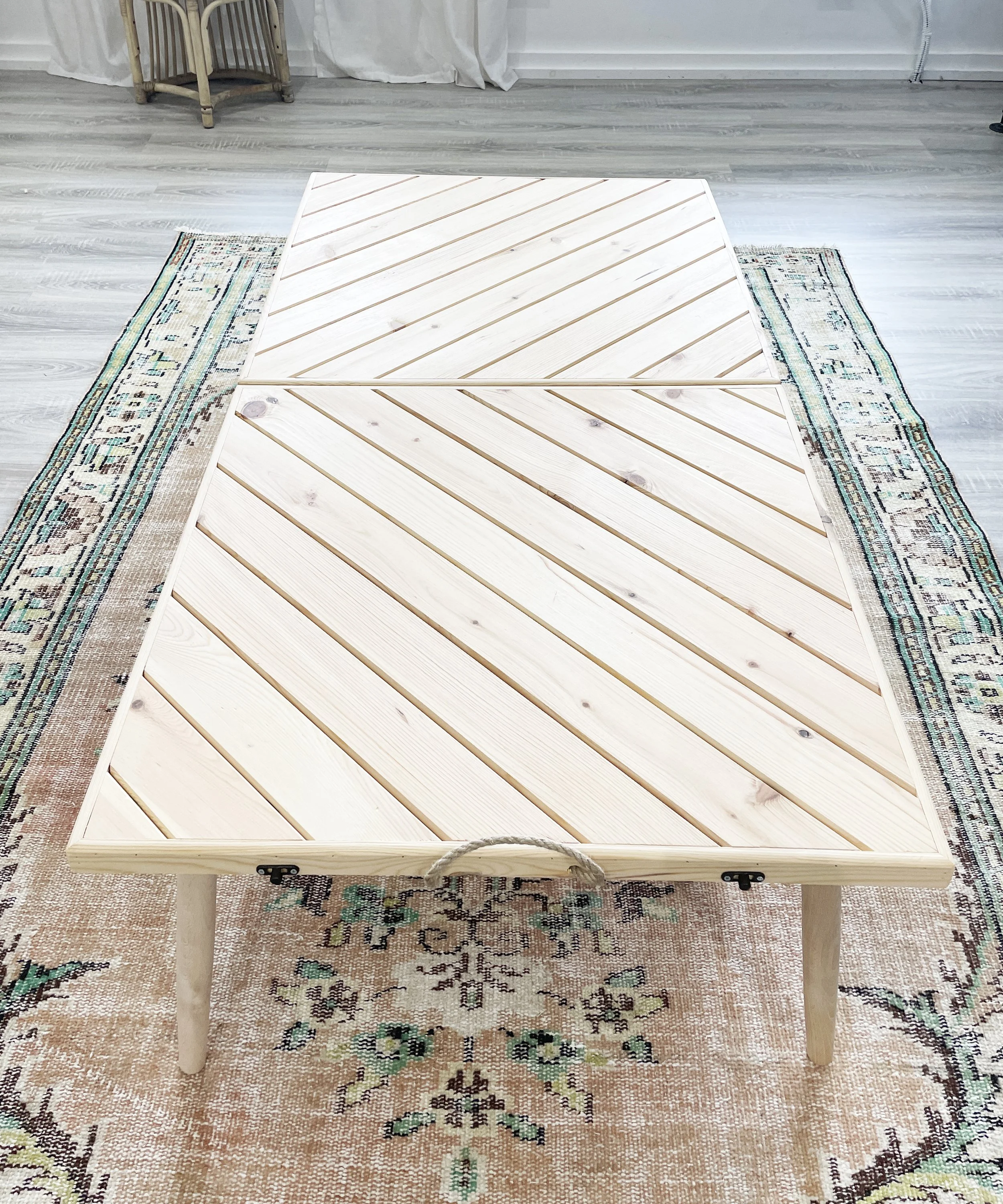 Natural wood folding picnic table that is low to the ground, perfect for a girl’s picnic, or beach proposal - measures 60” long, 30” wide and 16” high - $50/day for table only, pillow and runner add-ons are available