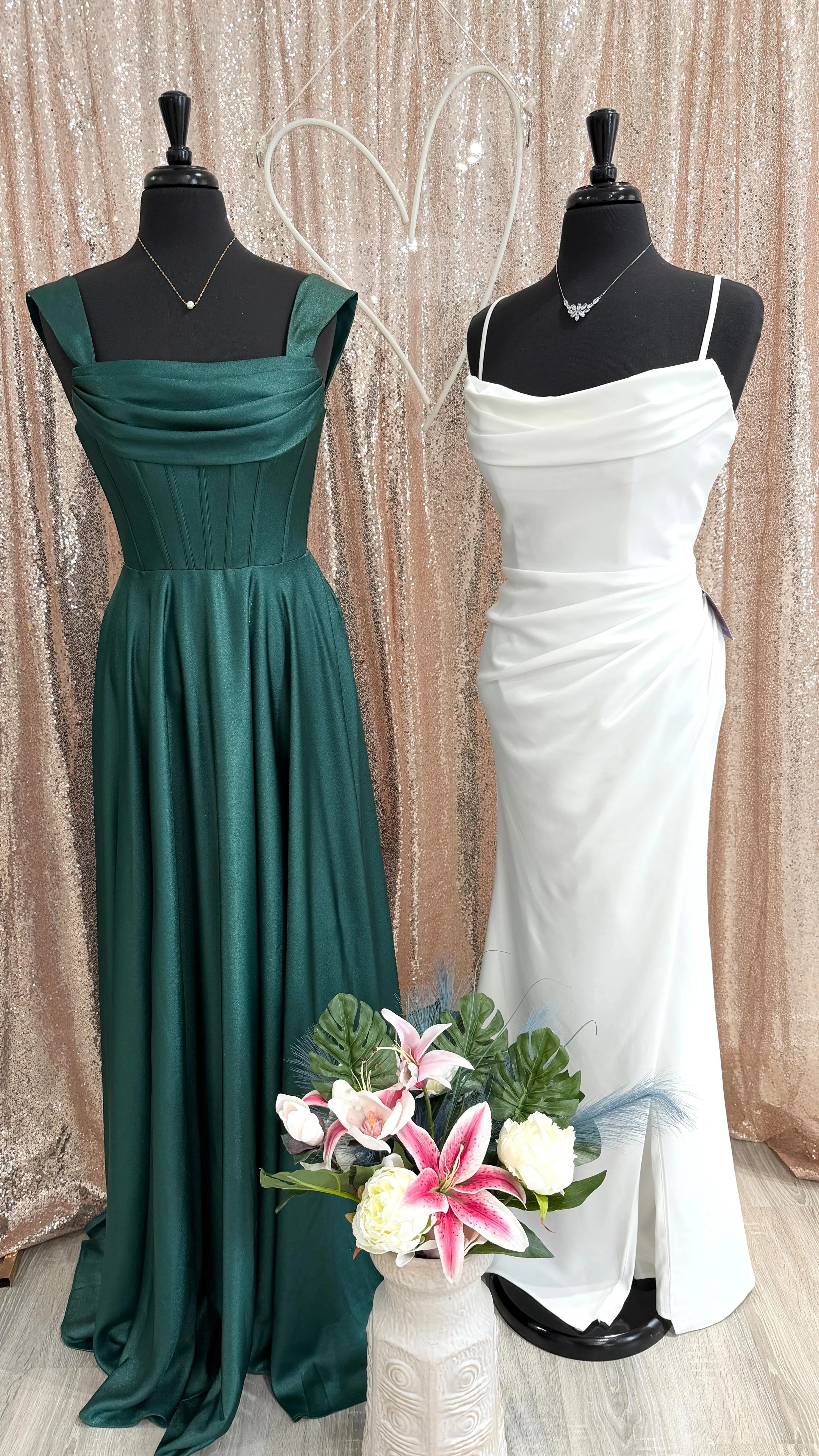 Make an entrance in this gorgeous satin wine fit to flare gown with corset style top and back, square neck and slit in size 8 by J’Adore Evening (style J28018) - available in other sizes and in emerald and navy.
